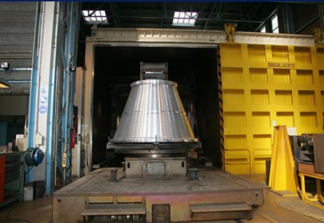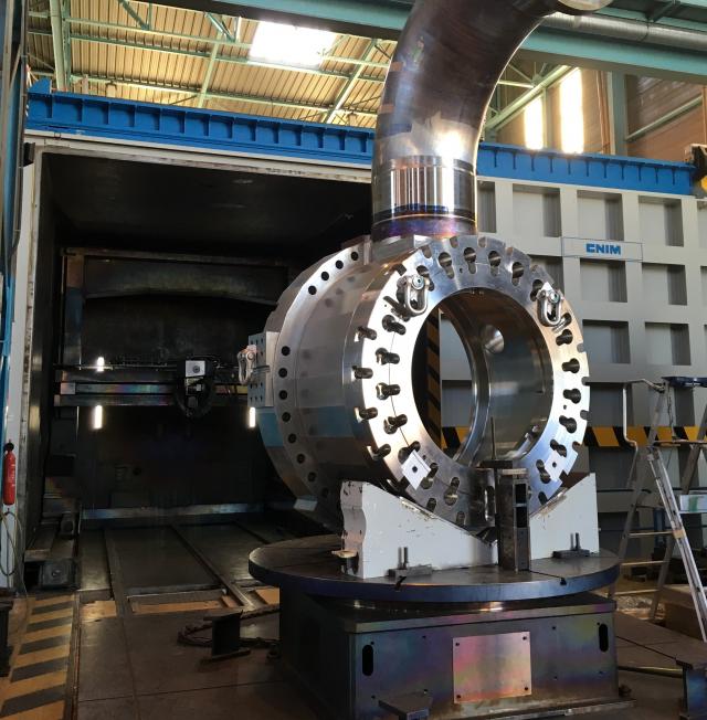 CNIM Systèmes Industriels welding facility has a useful volume of 230 m3, measures L 7.4 x W 5.5 x H 5.05 metres and has a capacity of 30 tons. It is equipped with a rotating plate and a two-axis 30 kW electron-beam nozzle mounted on a five-axis gantry. This machine is suitable for large parts with complex geometries.